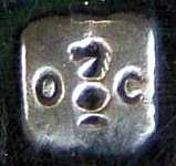 "O" and "C" in a square box is used to indicate the silver-plating. The size of the mark for silver-plating with a "knight" chess figure is