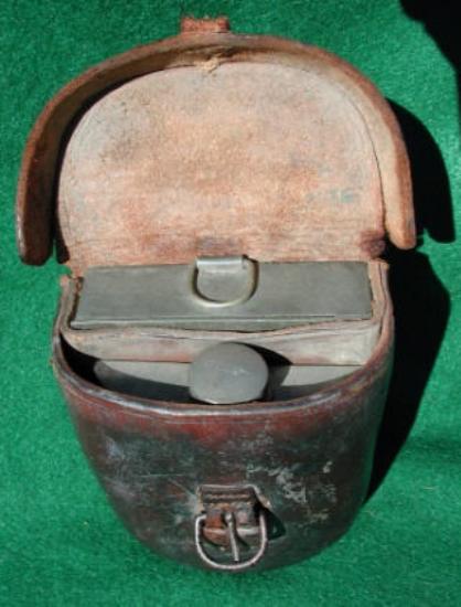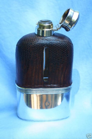 The saddle flask are an elongated metal or glass container with a pointed end and hinged silver stopper encased in a leather