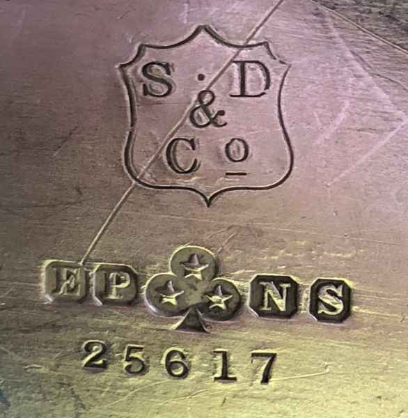 Electroplated materials are often stamped EPNS for electroplated nickel on silver, or EPBM for electroplated Britannia metal.