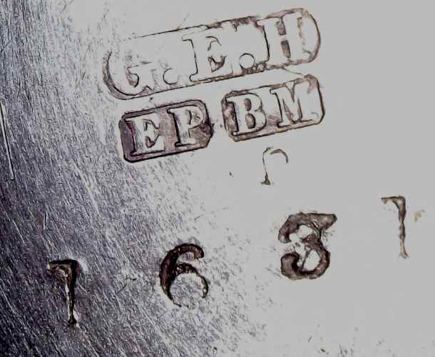 HARWOOD, SONS & HARRISON Birmingham partnership of Henry Millington Harwood and Walter Andrew Harrison owners of Harwood, Sons & Harrison. Circa 1883-1886 Henry Hodson Plante entered in the partnership and the silversmiths and spoon makers' activity changed its name to Harwood, Plante & Harrison (active at 185-187 Newhall Street, Birmingham and 12 Hatton Garden, London). In 1886 Walter Andrew Harrison left the partnership and the activity continued at the same address as Harwood & Plante. The partnership between Harwood and Plante was dissolved in 1892 (the activity was continued as Harwood & Son until c. 1894-1899). The lozenge/diamond with "P" is a mark used by Henry Hodson Plante. see HENRY HODSON PLANTE for further information |