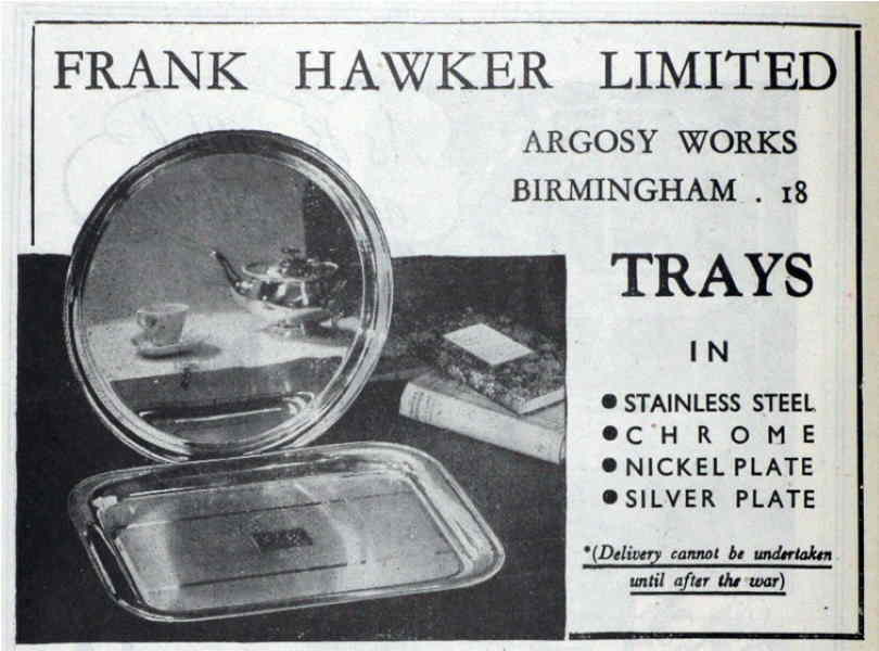 FRANK HAWKER LTD FRANK HAWKER CARPATHIAN SILVER CO LTD Birmingham Carpathian Silver Company (founded by Frank Hawker in 1886) was known simply as Frank Hawker Ltd. The business was active in Argosy Works, 44-54 Spencer Street, Birmingham. The firm survived the death of the founder (Frank Hawker 1868-1938) and participated until 1953 to British Manufacturers Fairs. The firm used the trade mark CARPATHIAN SILVER and CRAFTON (widely exported in the USA). ARGENT PLAQUÉ/METAL BLANC mark was probably used for export to France and another to celebrate Queen Elizabeth II coronation. |