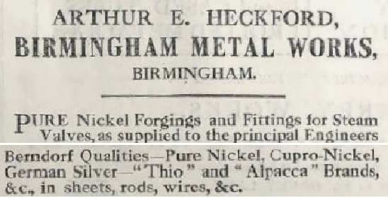 ARTHUR E. HECKFORD Birmingham Arthur Egerton Heckford was active from 1893 in the Berndorf Metal Works, Frederick Street, Birmingham as work manager/agent/successor of the Austrian Company Berndorf Metal Works. Later, the name was changed to Birmingham Metal Works (c, 1912). Arthur E. Heckford died in 1926 and the business was carried on by his two sons, who had been in partnership with him for some years. The company used the trade mark SILVERMINIUM and became "Ltd" 1928. |