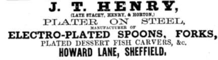 J.T. HENRY Sheffield Manufacturer of electroplated spoons and forks. Late Stacey, Henry & Norton active c.1864 at Howard Lane, Sheffield, later Lincoln Electro-Plate Works, Arundel Street, Sheffield |