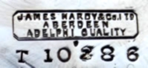 JAMES HARDY & CO JAMES HARDY & CO LTD Aberdeen Probably successor to James Hardy, clock and watchmaker, 14 Union Street, Aberdeen, 1860, at No 41 in 1865 and No 53 by 1880. Became James Hardy & Son and James Hardy & Co (c.1880). Branches were opened in Edinburgh and Glasgow. London branch was sold to William Duncan Cooper in 1897. James Hardy & Co Ltd was active in Edinburgh 1939-70 succeeding to Mackay, Cunningham & Co as diamond merchants, watchmakers, jewellers & silver smiths. Hardy & Co and Hardy & Co Ltd acted as retailers of Roberts & Belk ('Aladdin lamp' trade mark) and Allen & Darwin ('Hourglass' trade mark) . |