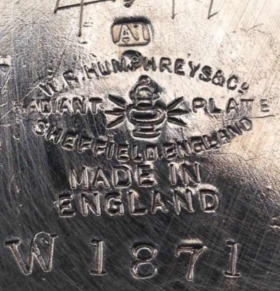Electroplated materials are often stamped EPNS for electroplated nickel on silver, or EPBM for electroplated Britannia metal.
