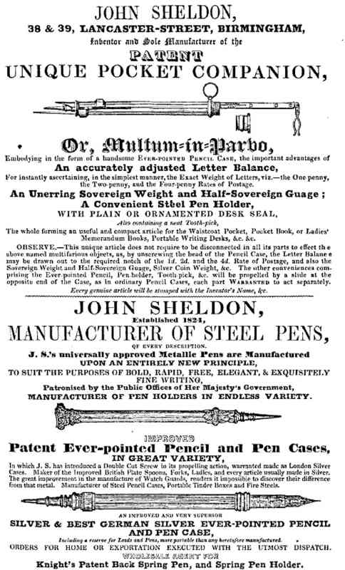 JOHN SHELDON JOHN SHELDON & CO Birmingham Established 1830 as John Sheldon & Co and soon after in a short partnership (closed in 1832) with Joseph Smith as Sheldon and Smith, making spectacle cases, tobacco boxes and gunshot charges. Activity continued at 38/39 Lancaster Street (c.1842), 55 Great Hampton Street, Birmingham and 33 Bucklersbury, Cheapside, London. Manufacturer of "... spoons, forks, ladles, butter and fish knives, tea, coffee and table services, cruet, liquor and egg frames... All warranted articles are marked with the Initials" |