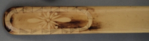 The handle has a trompe oeil decoration in pyrography (pyrography is a process of producing design on wood or other material by using heated tools or a fine flame).