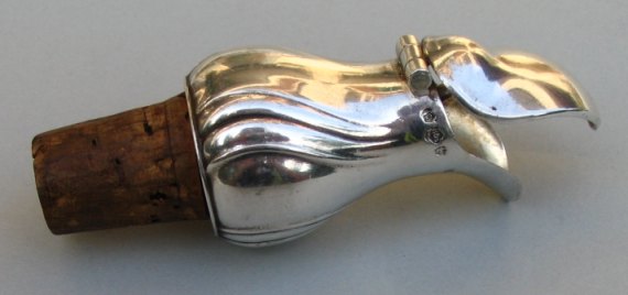 It has a pivoting hinged lid opening with a counterpoised device and is hallmarked with half-moon and crown, '800' (800/1000 silver) and silversmith mark. The silver stopper is 2 in. long (cm. 5) and was bought by an Italian dealer.