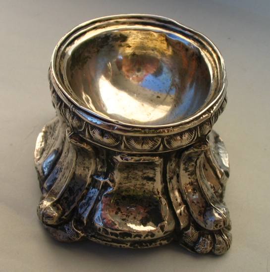 The salt is embossed on a thin sheet of silver (loaded with another material) and stands on four ornate feet.