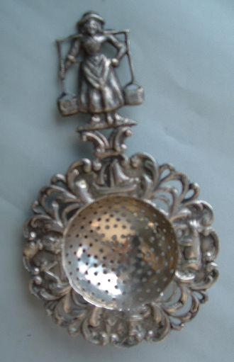 Dutch antique silver tea strainer this figurative silver tea strainer was made by silversmith Yvo Theodorus van Erp (19 June 1824- 30 January 1911) who worked in Leewarden (Friesland - Holland) from 1857 to 1908. It is marked VE and "hammer and chiesel" corresponding to the period 1906/1908.