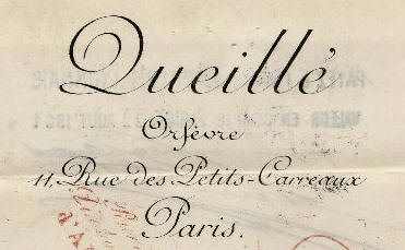 Ensuite Eugène Queillé, orfèvre, reprend l’atelier, s’installe au 8 Petite rue Saint-Roch-Poissonnière, enregistre son poinçon le 11 février 1847 (ref. N° 01562 des Archives de la Garantie, Paris).