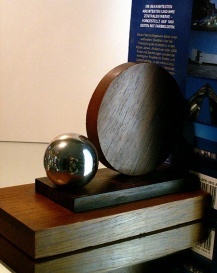 this is a pair of Art Deco / modernist bookends featuring a round wooden slice next to a chrome ball