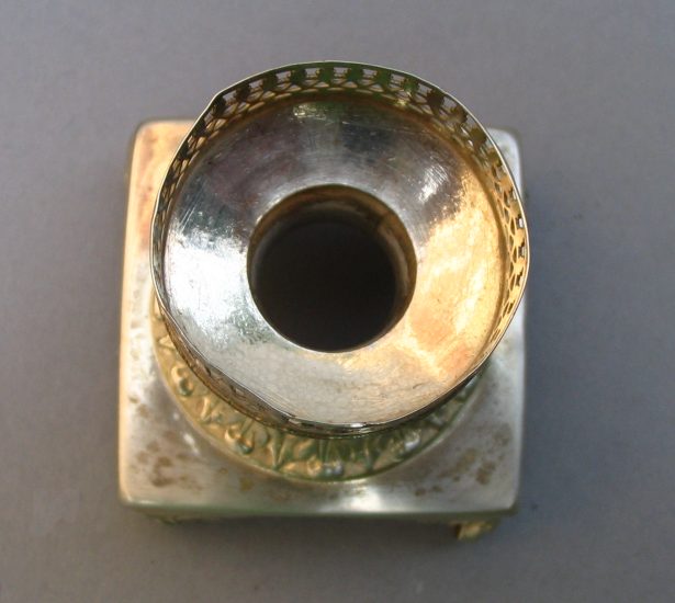 The flower holder have a diameter of 1 1/2 in. (cm. 4) on the bowl, is 3 in. (cm. 7,5) high and was bought from a Dutch dealer through the Internet.