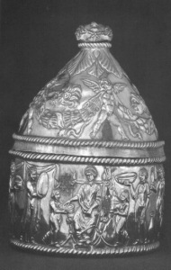 - un recipiente cilindrico con coperchio conico sbalzato con scene della